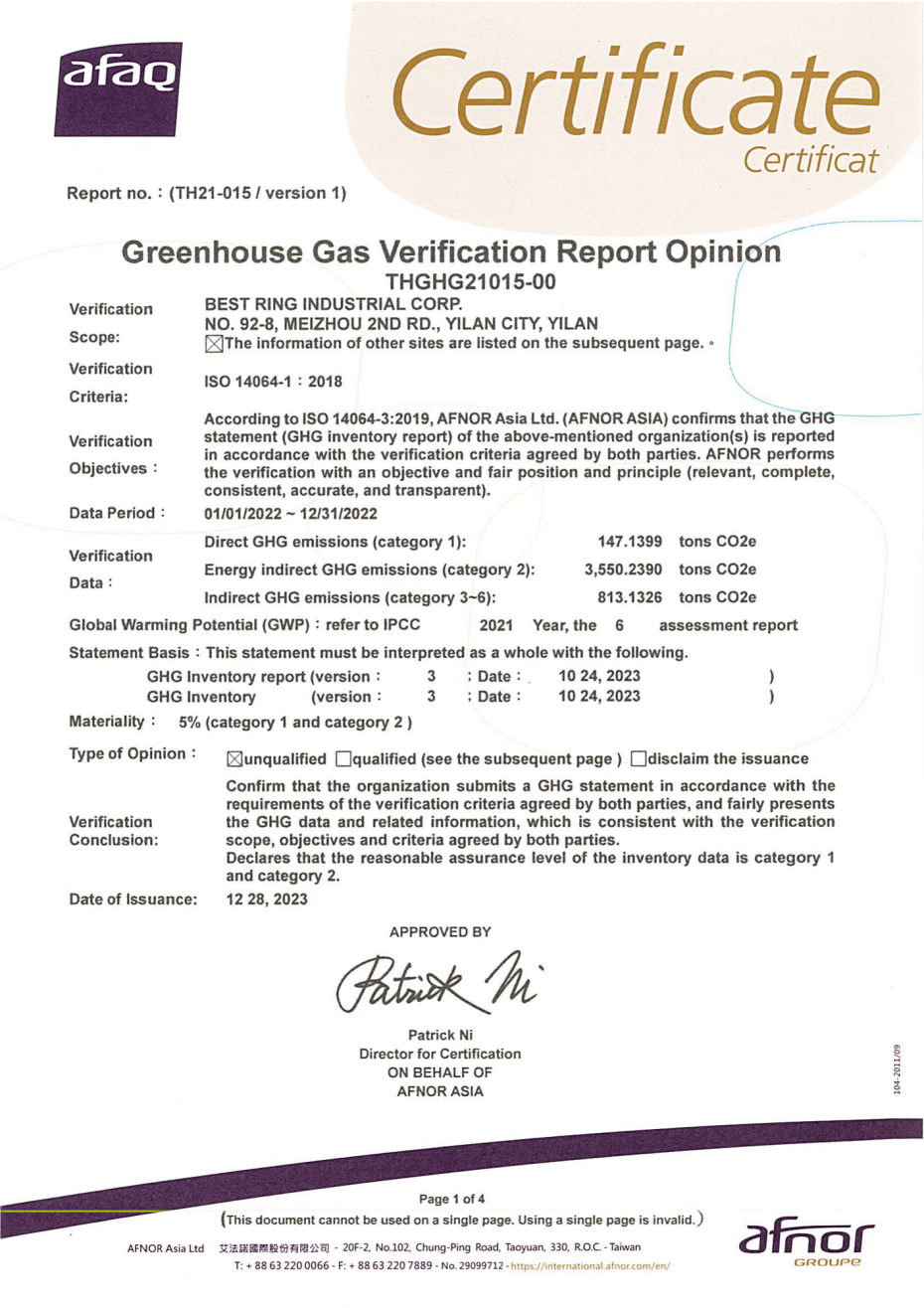 Greenhouse Gas Emissions Verification Opinion StatementVerification of Greenhouse Gas Emissions- Best Ring takes the lead in carbon inventory and achieves the goal of ESG sustainable management.