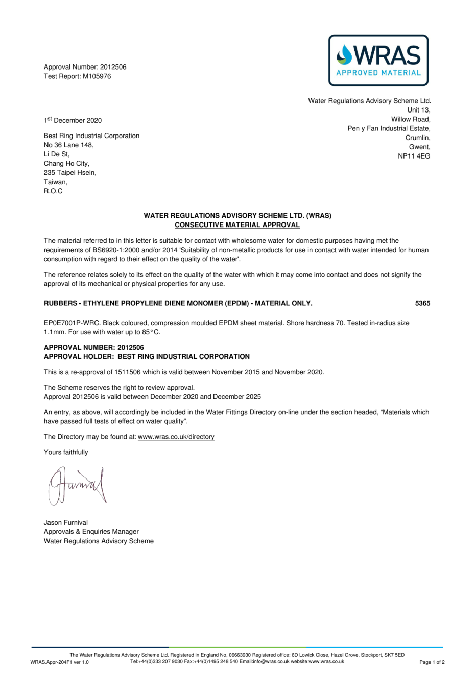 The Water Regulations Approval Scheme is an independent UK certification body for plumbing products and materials, helping business and consumers choose compliant products that keep water safe. Best Ring offers elastomeric sealing products like o-rings, seals and gaskets, diaphragms and custom molded parts which complies with the above standards.