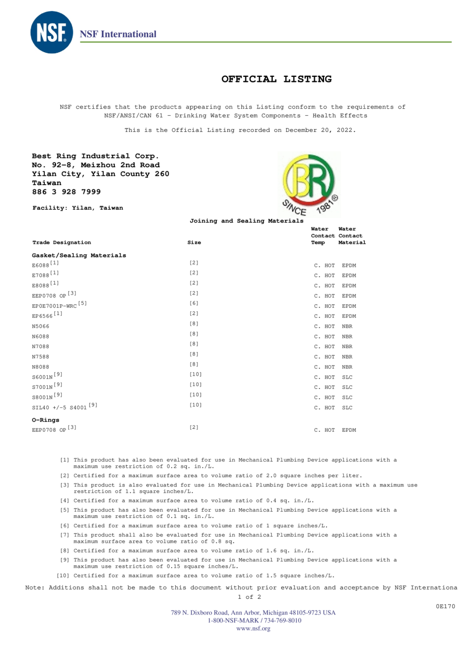 NSF is the most recognized health effects standard in North America for municipal water treatment systems and products. This standard sets health effects criteria for chemical contaminants that may leach from materials, components and devices into drinking water. Best Ring offers elastomeric sealing products like o-rings, seals and gaskets, diaphragms and custom molded parts which complies with the above standards.
